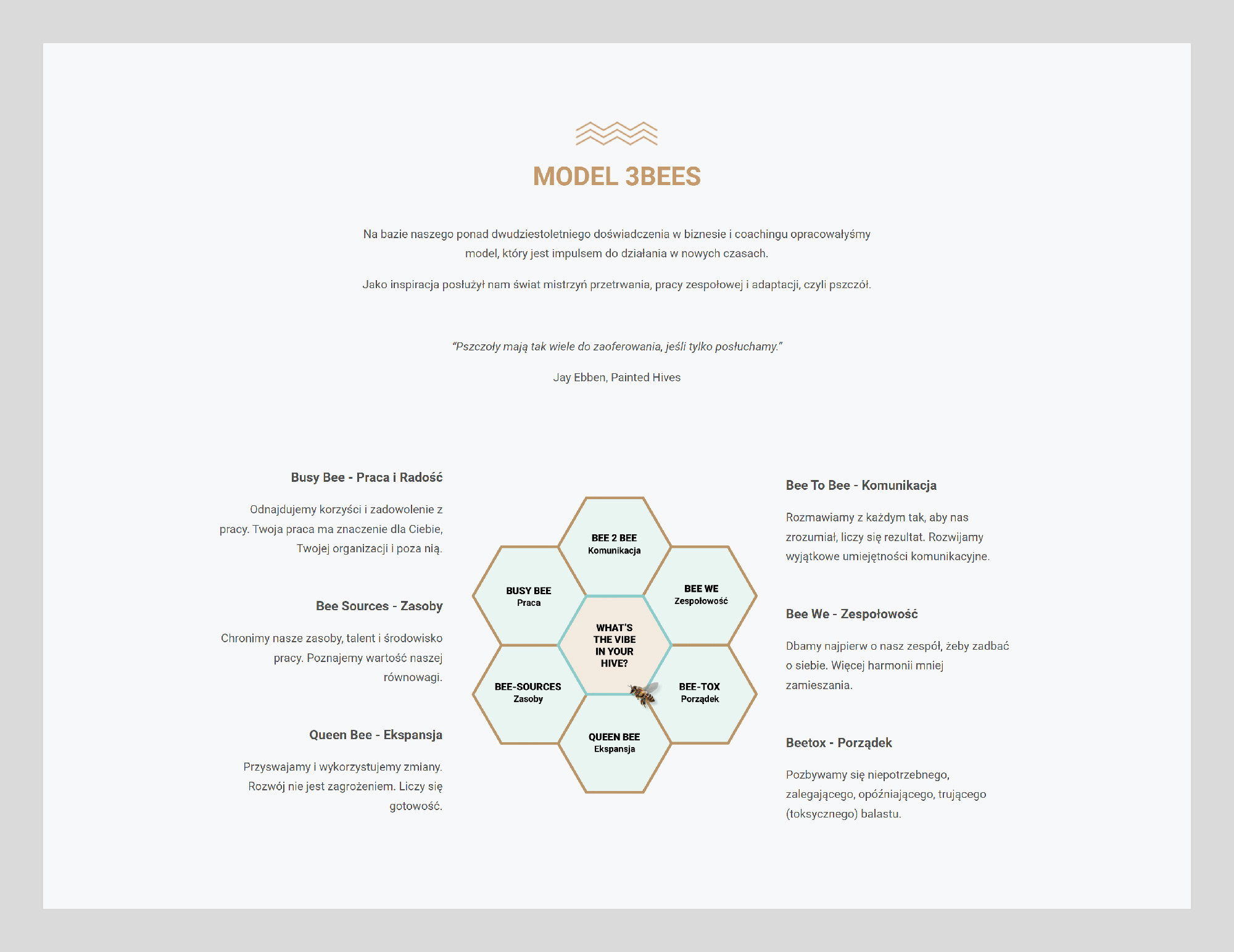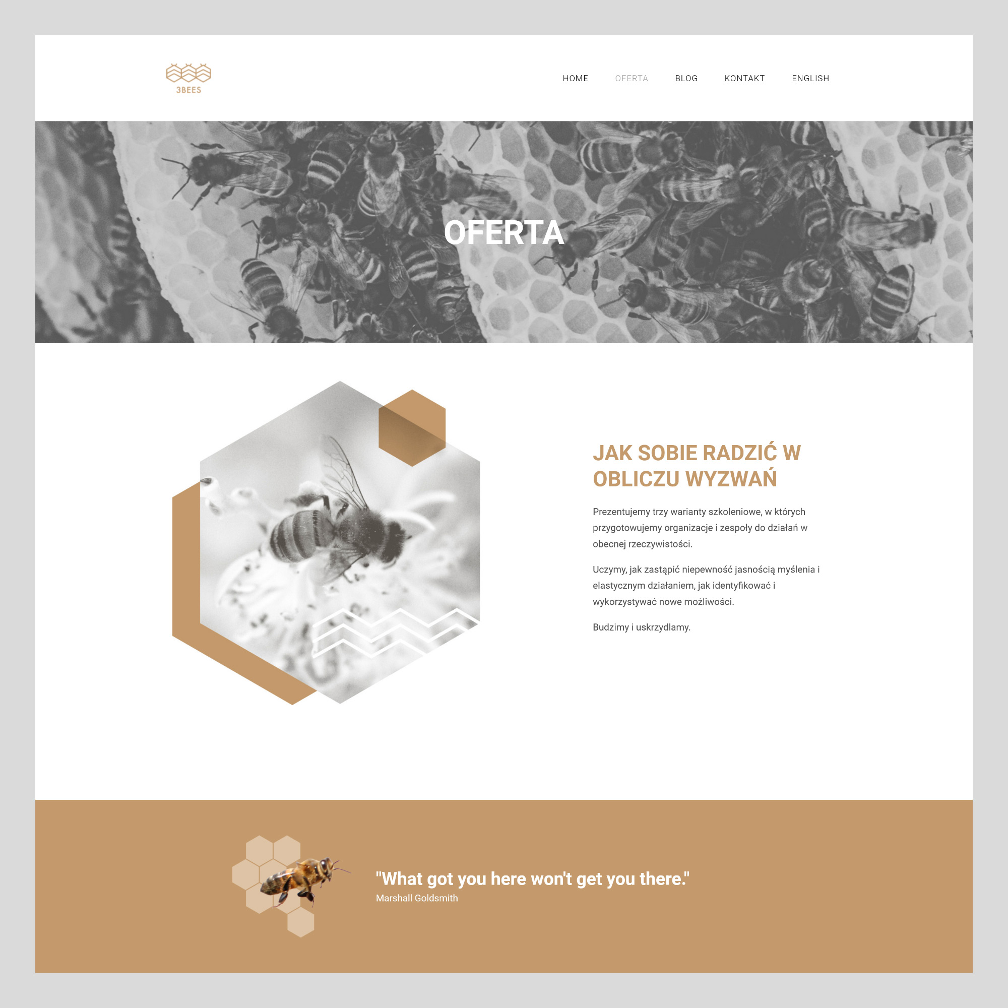 Serwis internetowy prezentujący szeroką ofertę coachingową wraz z inspiracjami, jakie za nią stoją. Sekcja blogowa zawiera artykuły, w których istotne wydarzenia wpływające na świat interpretowane są przez pryzmat pszczelej idei.