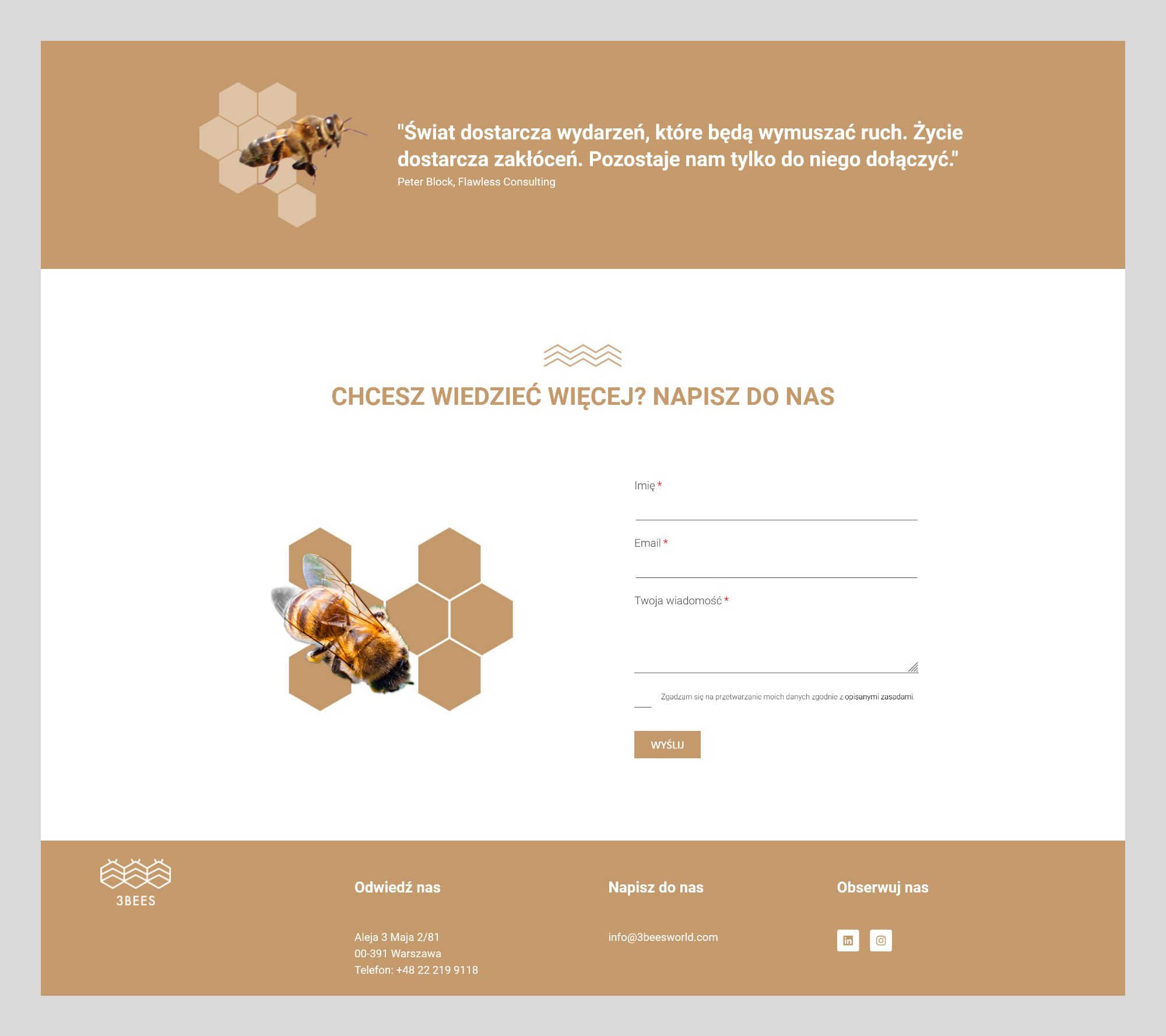 Ta idea przyświeca Izie, Mai i Dorocie, które jako 3Bees stosują w coachingu zespołów metody zaczerpnięte wprost z pszczelego roju. Ich styl wizualny i strona internetowa odzwierciedlają wartości, którymi się kierują: optymalne środowisko pracy wpływające na radość z jej wykonywania, jasna komunikacja, harmonijna współpraca i lekkość pozbawiona niepotrzebnego balastu.