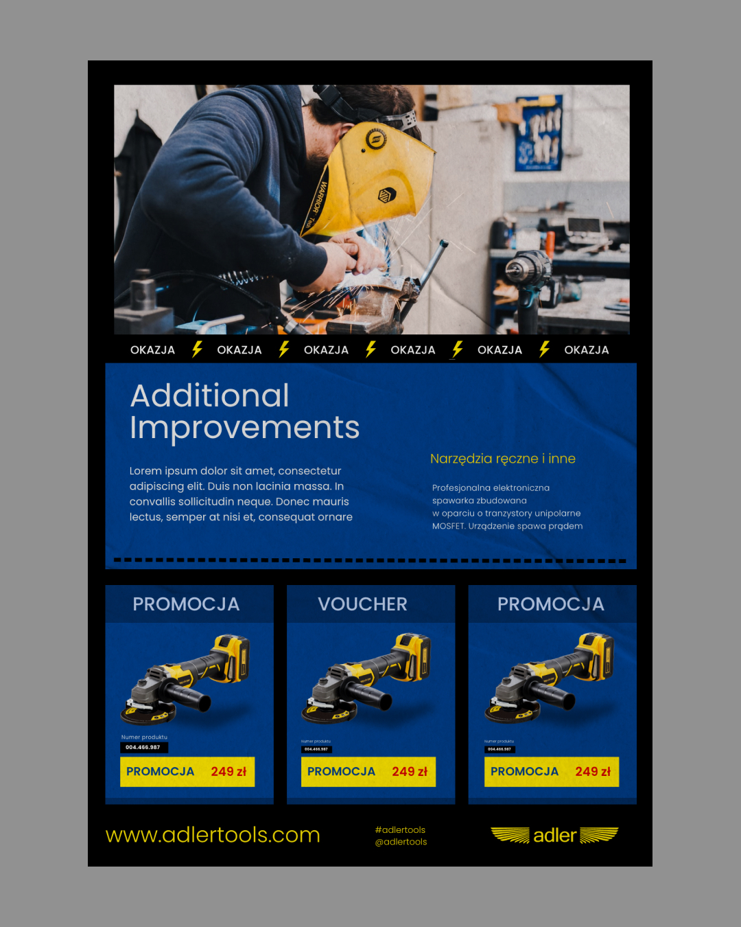 Adler Tools, polski dystrybutor profesjonalnych narzędzi dla sektora przemysłowego i budowlanego, borykał się z brakiem efektywności operacyjnej w swoich procesach marketingowych. Materiały promocyjne były tworzone ręcznie, co ograniczało skalowalność i spowalniało wprowadzanie kampanii. Strona internetowa funkcjonowała głównie jako statyczna wizytówka i nie pozwalała na dynamiczne zarządzanie promocjami.