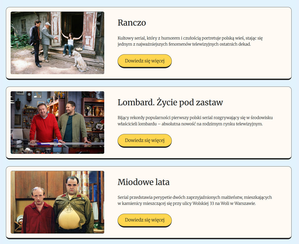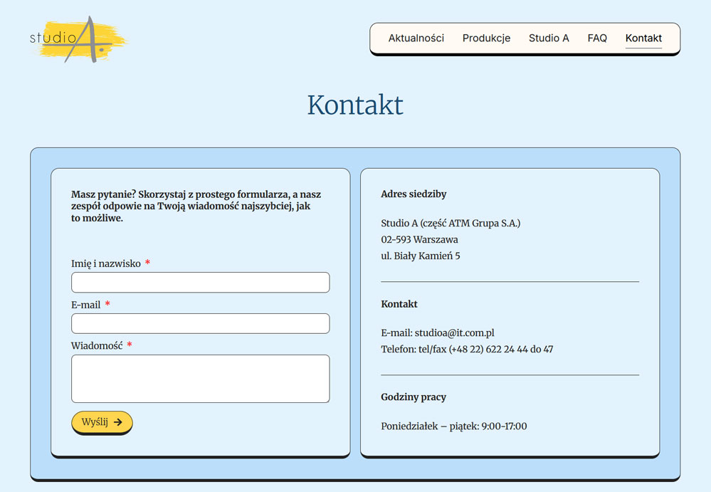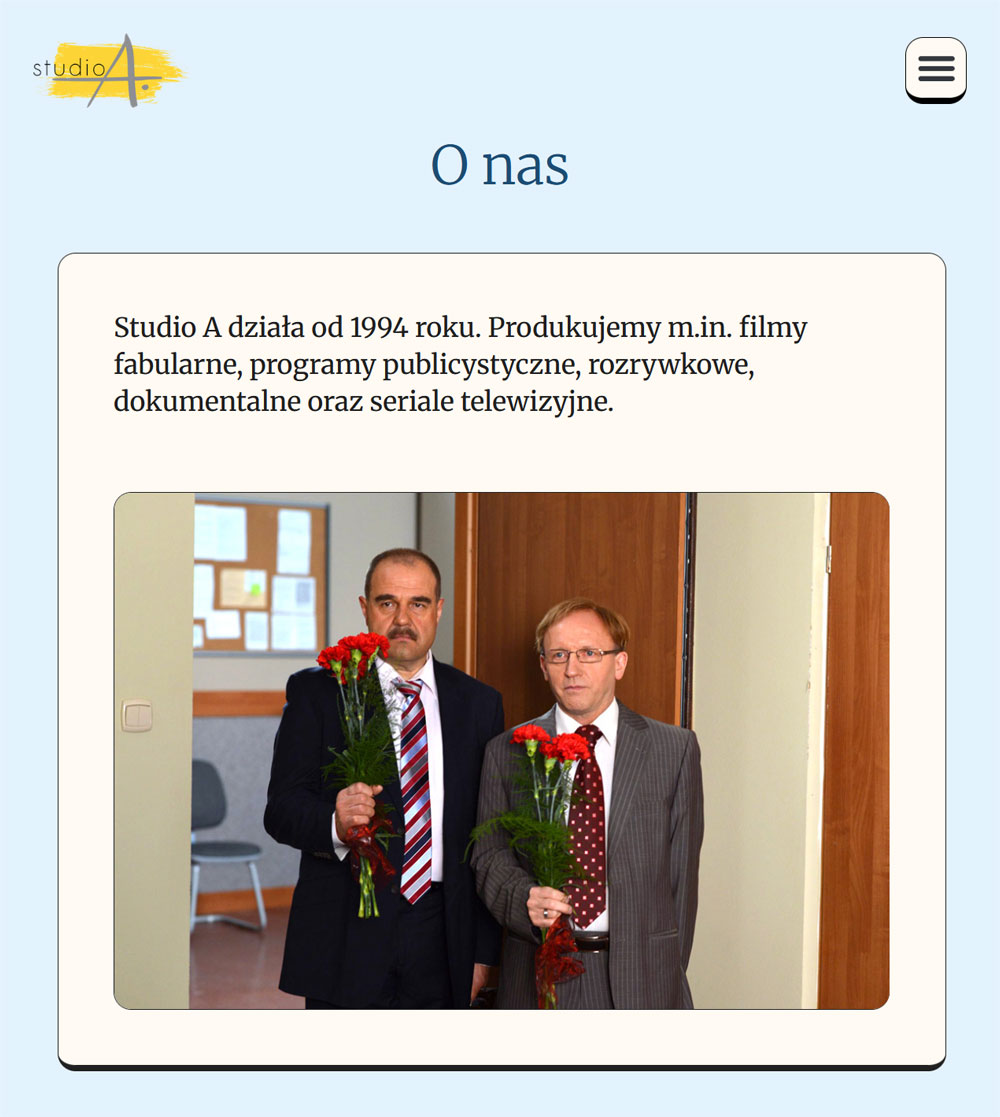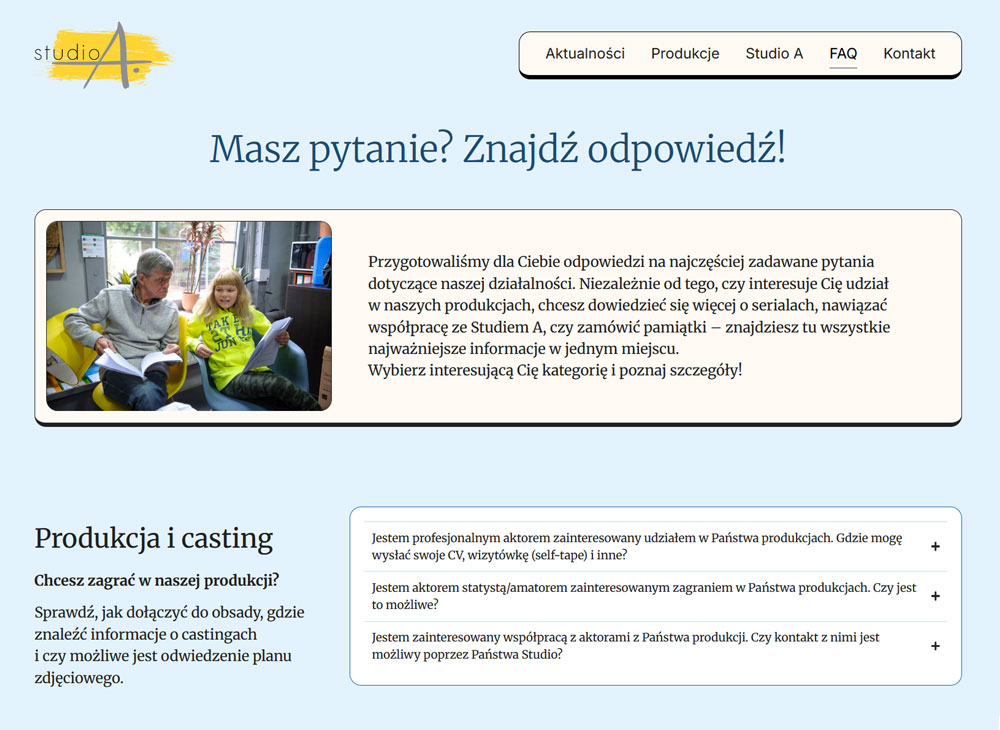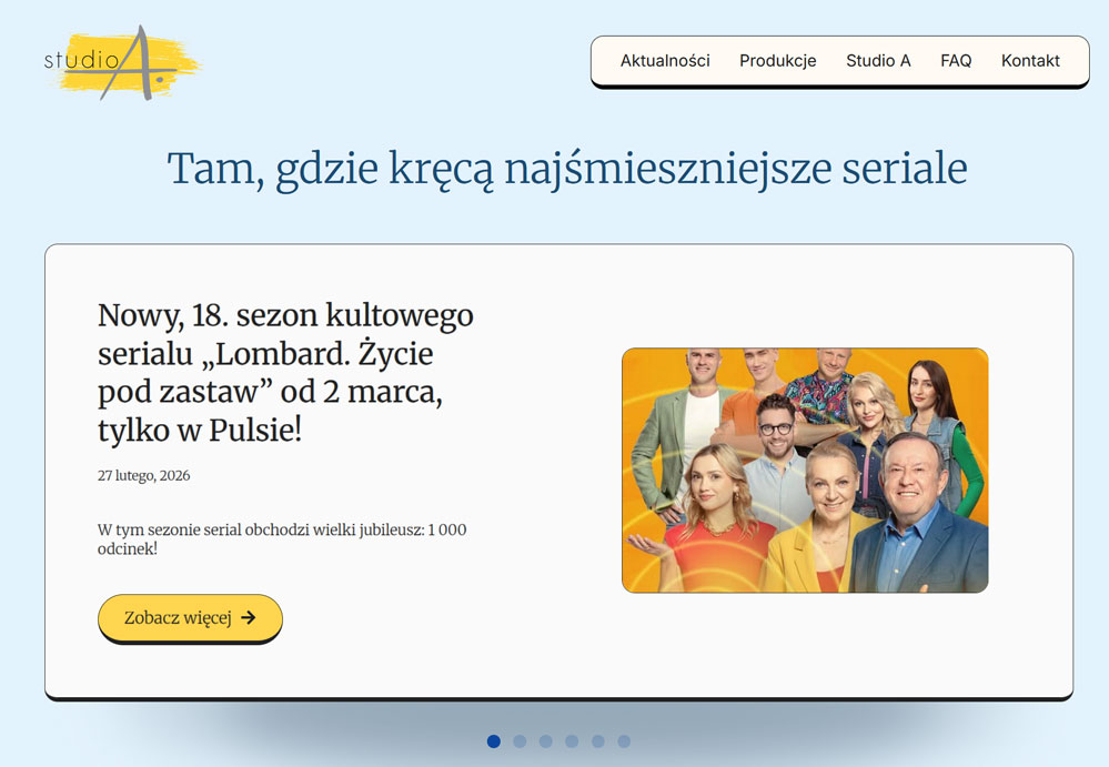 Studio A jest producentem popularnych seriali komediowych. Przez lata zgromadziło wiele treści dotyczących produkcji – zdjęć, opisów, etc., których prezentacja w dotychczasowym serwisie przestała być wystarczająca na obecne potrzeby. Powstała więc konieczność, by stworzyć całkiem nowa przestrzeń do ich zaprezentowania.